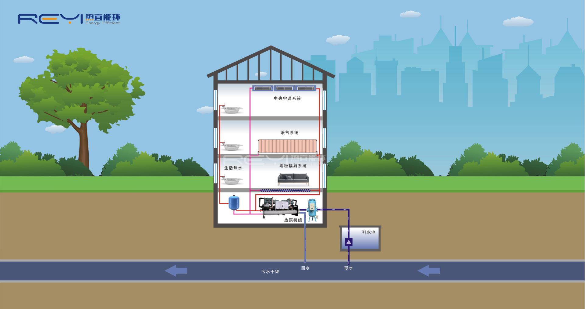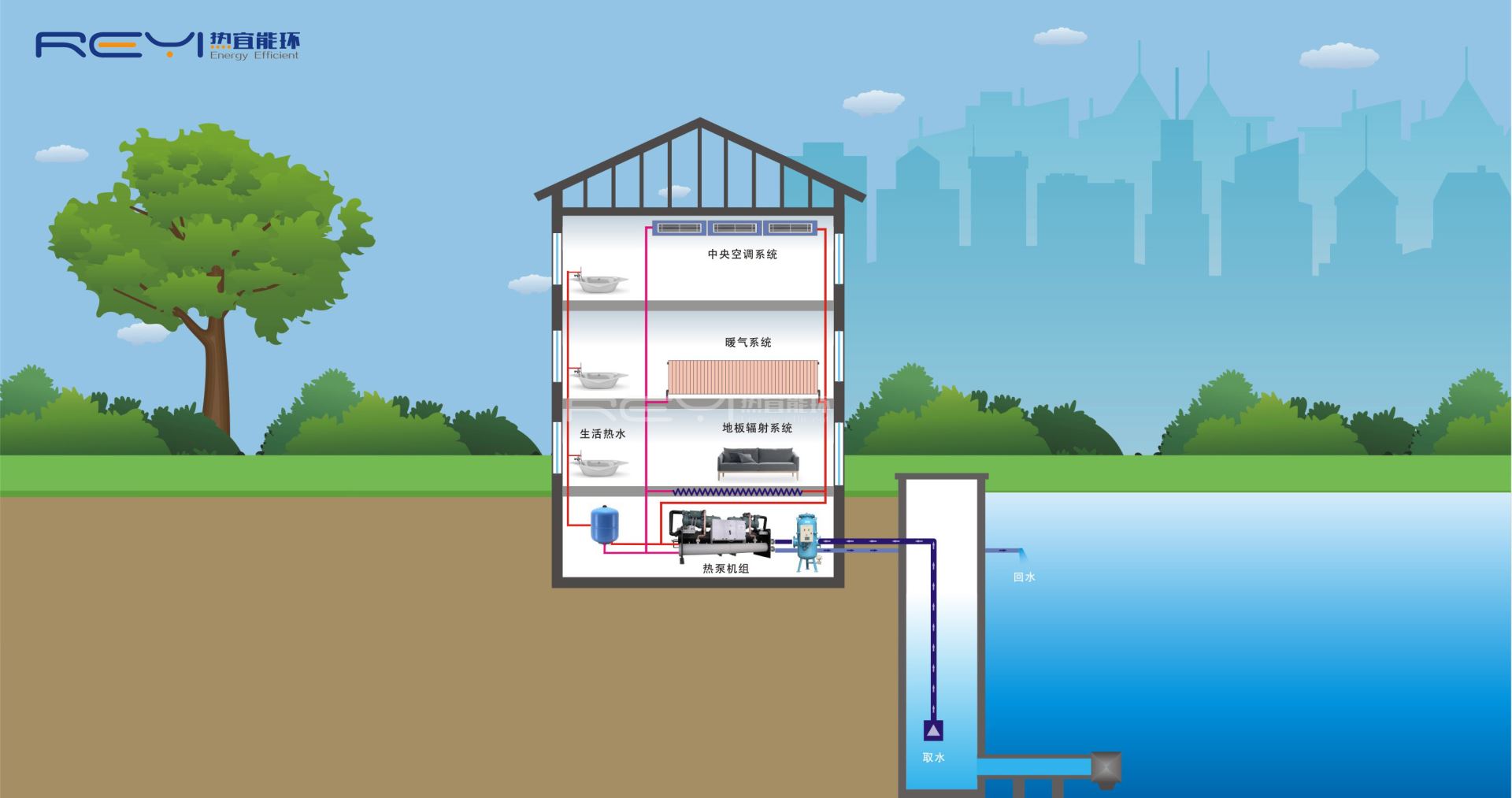 冬季工况:抽取大自然水体(图江河湖海)中的水,通过热泵使水体中的低位热能变为高位热能实现室内采暖。